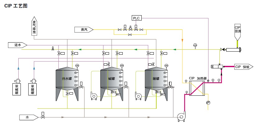 CIP 在線清洗系統(tǒng)是指定設(shè)備(罐體、管道、泵、過(guò)濾器等)及整條生產(chǎn)線在無(wú)需人工拆開(kāi)或打開(kāi)的前提下,在一個(gè)預(yù)定時(shí)間內(nèi),將一定溫度的清洗液通過(guò)密閉的管道對(duì)設(shè)備內(nèi)表面進(jìn)行噴淋循環(huán)而達(dá)到自動(dòng)清洗的目的。主要由單個(gè)或多個(gè)清洗液貯罐及管道、分布器、增壓泵、回流泵、氣動(dòng)控制閥、酸堿計(jì)量泵、板式換熱器、溫度控制儀、電導(dǎo)率檢測(cè)儀、液位控制儀及PLC 觸摸屏、控制柜等部件組成。